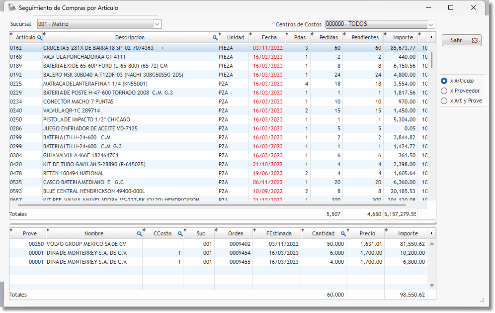 Este visor muestra la informacion de las partidas (parte superior) y de las ordenes de compra (parte inferior). Con los botones de la parte superior del visor, se pueden filtrar por Sucursal o por Centro de costos, adicional se pueden acomodar por Artículo, por Proveedor o por Artículo y Proveedor.
