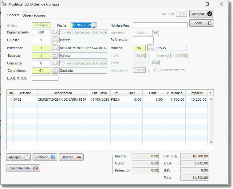 Al dar doble clic en el renglón de la orden de compra, se abre una nueva ventana donde se muestra, para consulta, la orden de compra original.