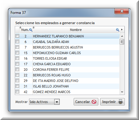 Las instrucciones son dadas en la ventana, seleccionar los empleados a generar constancia. Se puede listar 'Activos', 'Inactivos' y 'Todos'.