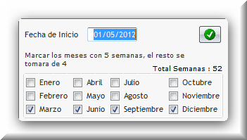 La segunda parte del calendario consiste en marcar (activar la casilla con la marca de verificación) los meses con 5 semanas, finalmente dar clic en el botón con el icono en color verde para ejecutar los cambios.